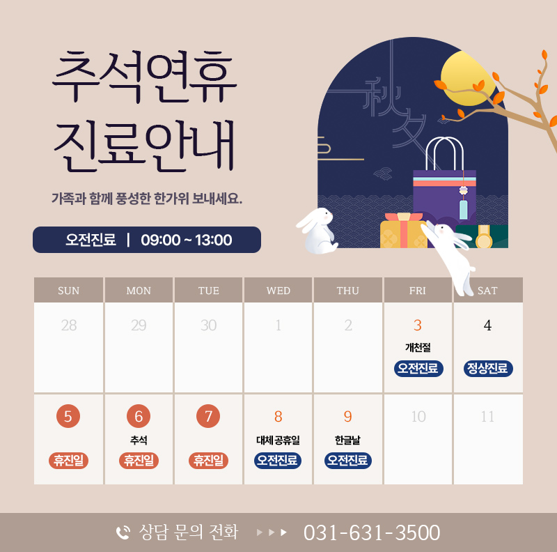 진료시간 안내 월 / 수 / 금 AM 09:00 - PM 18:00 화 / 목 (야간진료) AM 09:00 - PM 20:00 토요일 AM 09:00 - PM 14:00 공휴일 AM 09:00 - PM 13:00 점심시간 PM 13:00 - PM 14:00 ※ 토요일, 공휴일은 점심시간 없이 진료 ※ 일요일 휴진